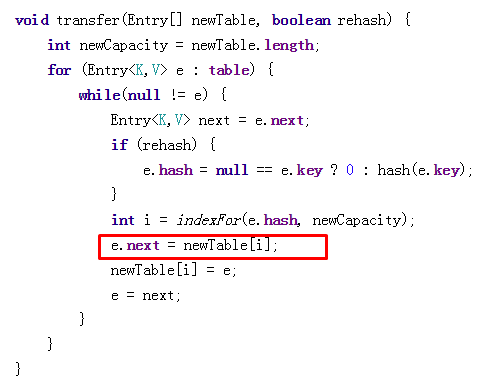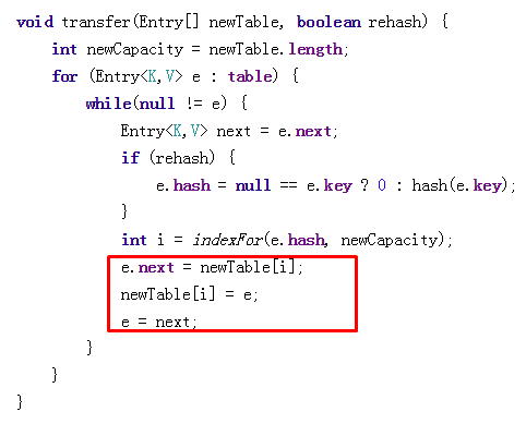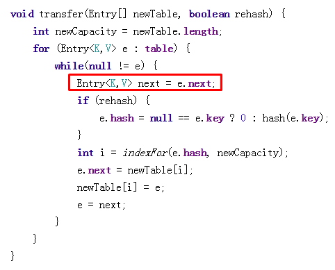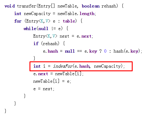 遍历原Entry数组,把所有的Entry重新Hash到新数组。为什么要重新Hash呢?因为长度扩大以后,Hash的规则也随之改变。