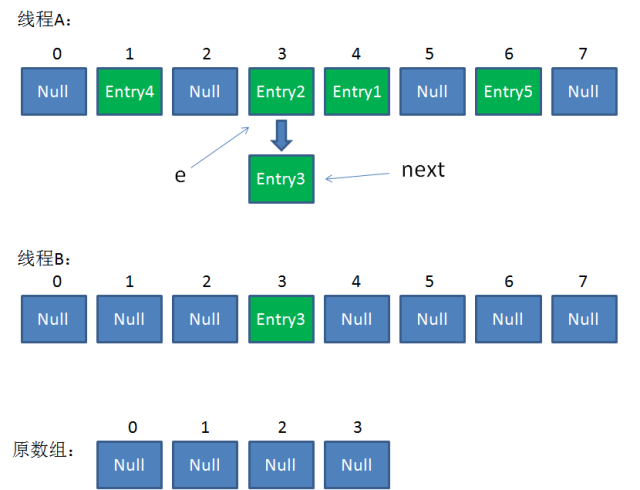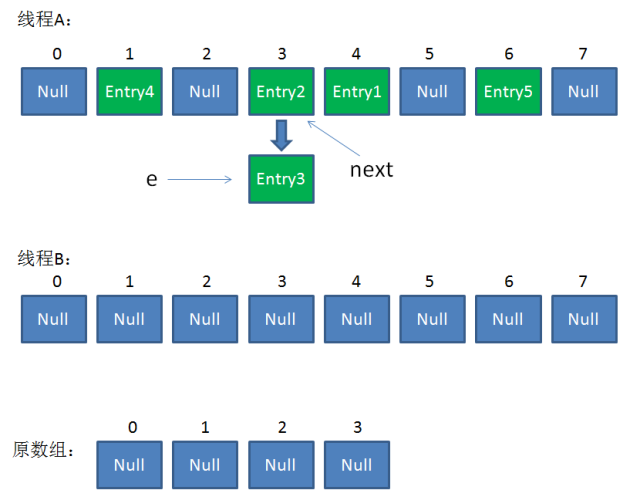 我们继续执行到这两行,Entry3放入了线程B的数组下标为3的位置,并且e指向了Entry2。此时e和next的指向如下:
