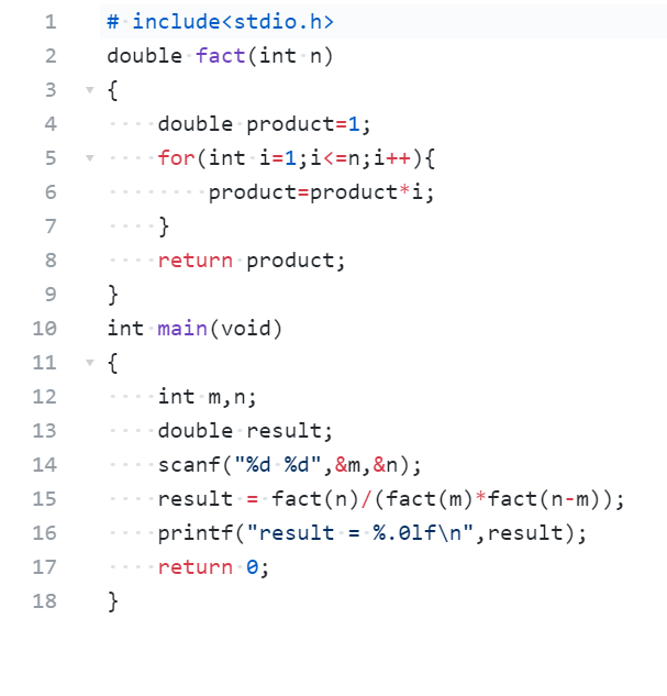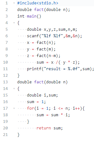 - 本题要求编写程序,根据公式C n,m=n!/(m!*(n-m)!)算出从n个不同元素中取出m个元素(m≤n)的组合数。建议定义和调用函数fact(n)计算n!,其中n的类型是int,函数类型是double。