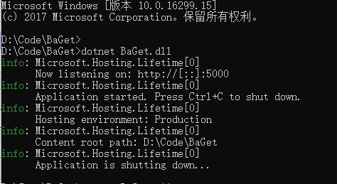 3.在解压目录打开cmd,输入dotnet BaGet.dll