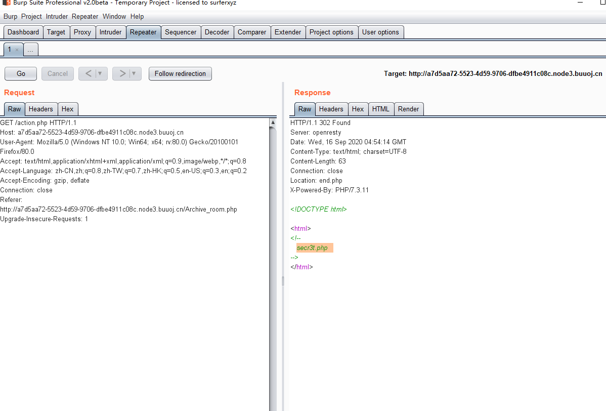 尝试构造payload:http://a7d5aa72-5523-4d59-9706-dfbe4911c08c.node3.buuoj.cn/secr3t.php/../../flag.php返回