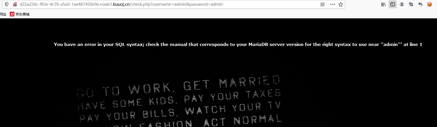 万能密码了一波后http://d22a226c-f83e-4c39-a5e0-1ae487450e9e.node3.buuoj.cn/check.php?username=admin&password=admin%27%20or%20%271%27=%271