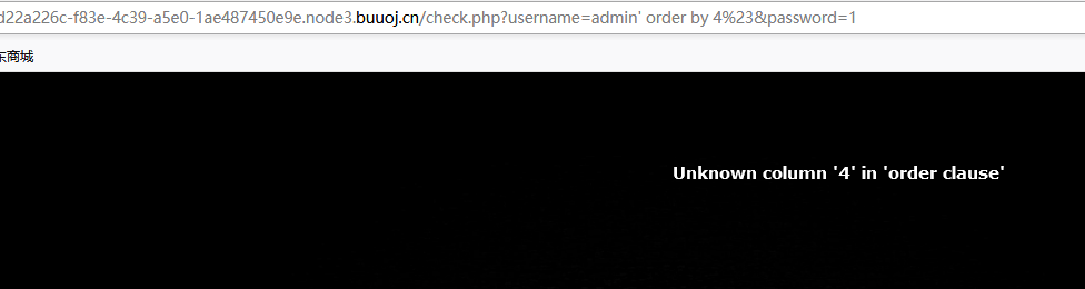 他告诉了我们密码但是好像木有什么用,接下来我们尝试爆破字段数,当输入4时报错,payload:http://d22a226c-f83e-4c39-a5e0-1ae487450e9e.node3.buuoj.cn/check.php?username=admin' order by 4%23&password=1,说明字段数为4