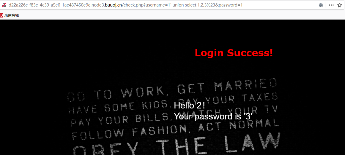 接下来用union查询测试注入点,username=1' union select 1,2,3%23&password=1,得到回显点位2和3