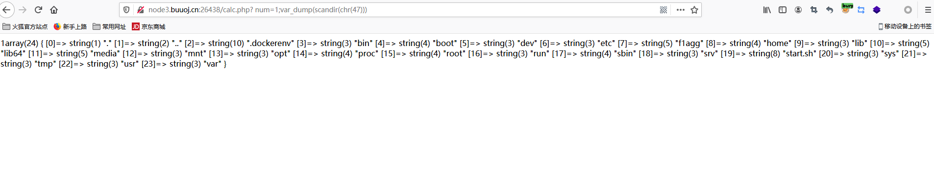 存在过滤,不能传递字母变量,利用php解析特性,将“num”换为“ num”。再将chr转换为ascll进行绕过。由于查看目录,构造? num=1;var_dump(scandir(chr(47)))