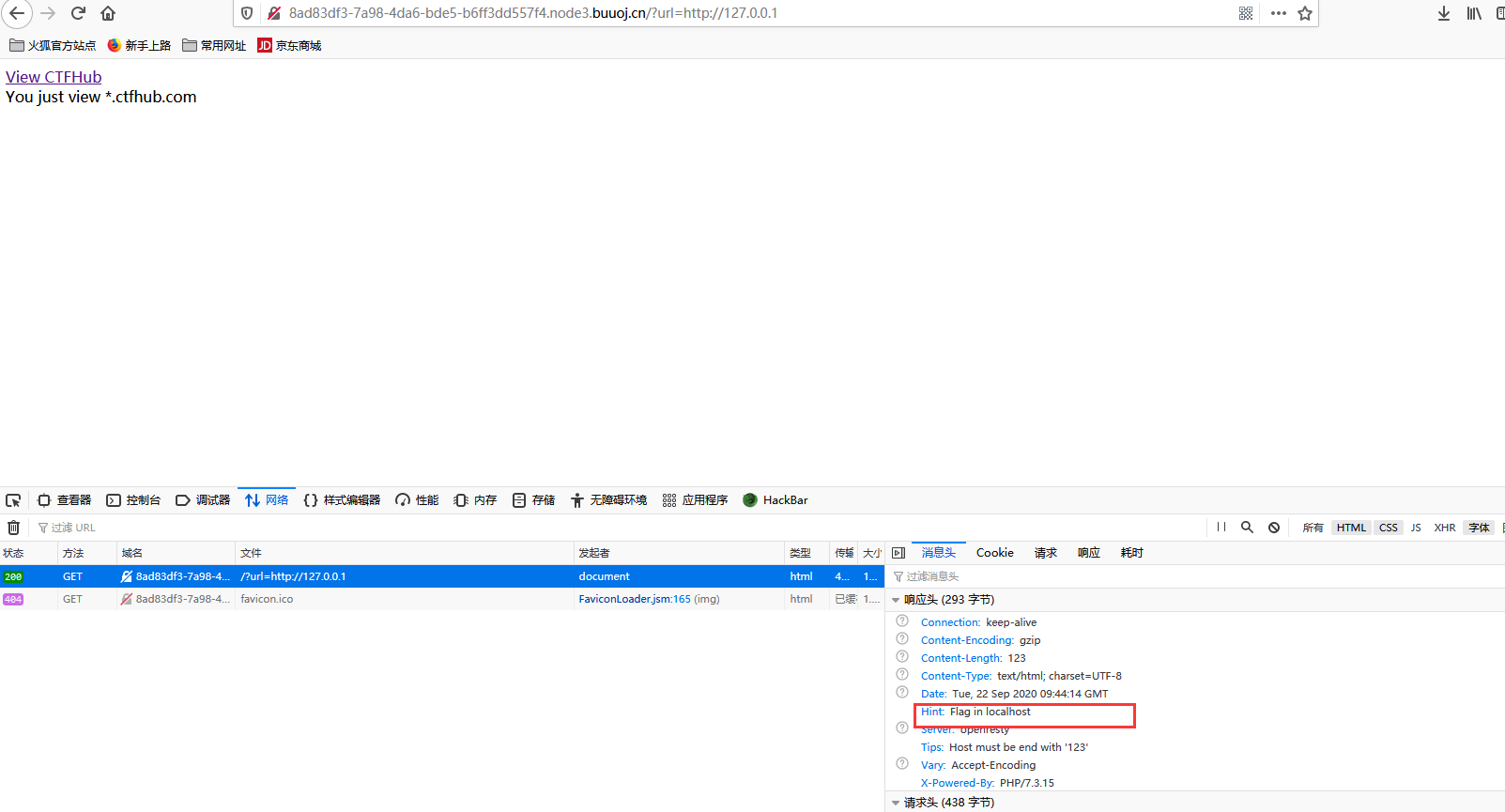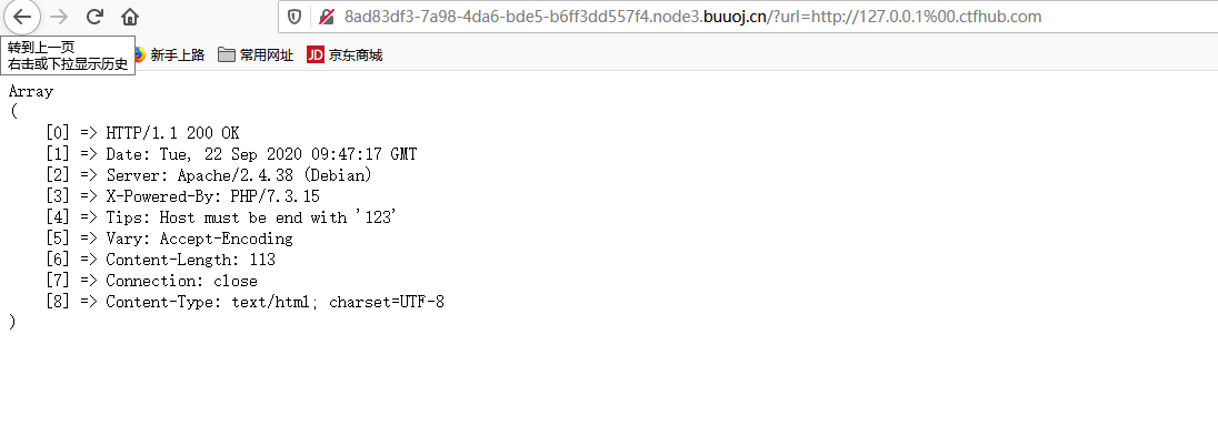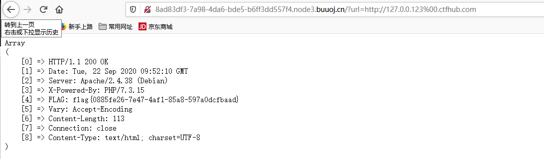 这里存在提示,Host must be end with '123',那就继续构造payload:/?url=http://127.0.0.123%00.ctfhub.com,得到flag