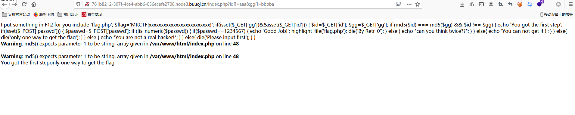 通过分析源码,通过数组来绕过,构造payload:http://761b8212-307f-4ce4-abb6-056ecefe2708.node3.buuoj.cn/index.php?id[]=aaa&gg[]=bbbba
