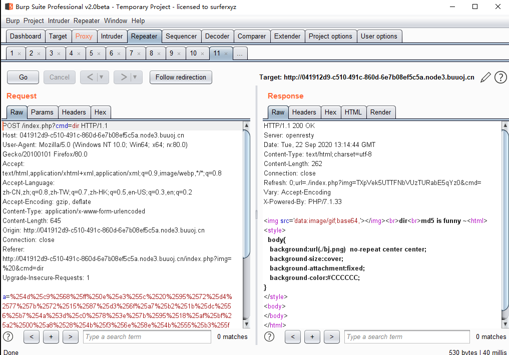 f12提示md5很funny说明跟md5有关,看到img=TXpVek5UTTFNbVUzTURabE5qYz0应该很敏感,使用base64解密一波MzUzNTM1MmU3MDZlNjYz0继续base64解密3535352e706e6630,百度之后再hex解码