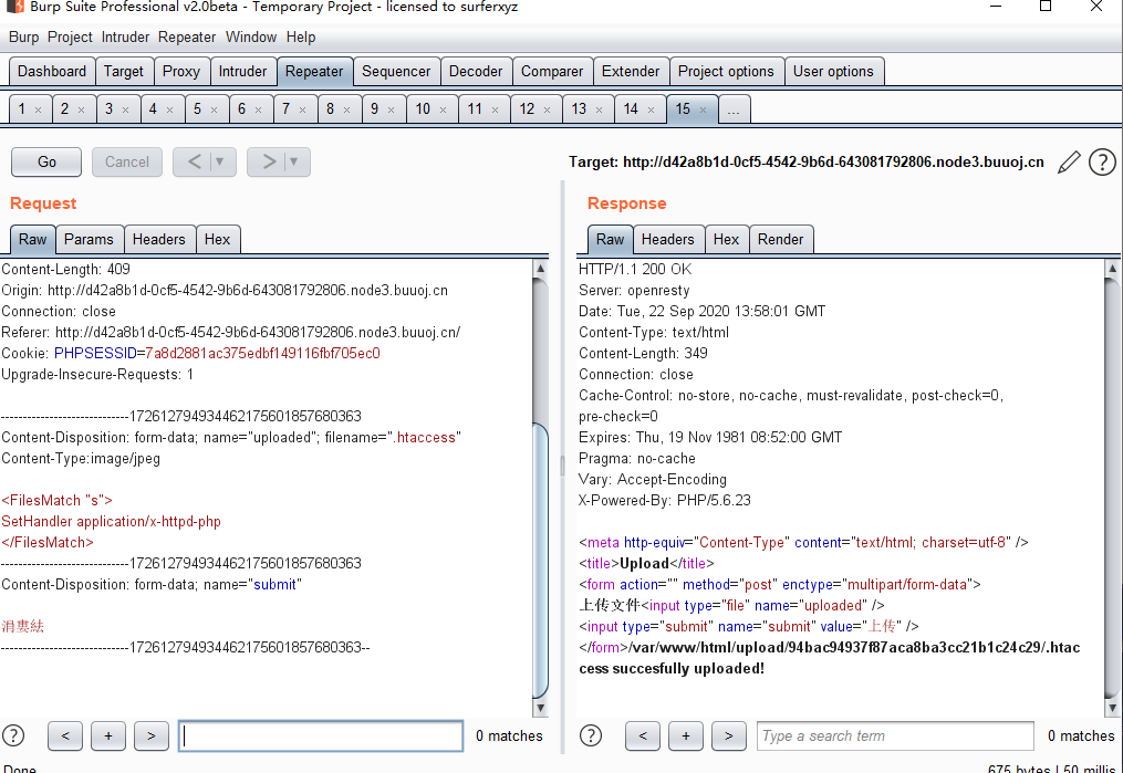上传php文件,显示不能上传以ph结尾的文件,所以直接上高速,上传.htaccess内容为