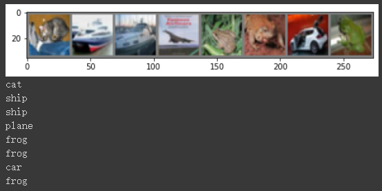 # 得到一组图像 images, labels = iter(testloader).next() # 展示图像 imshow(torchvision.utils.make_grid(images)) # 展示图像的标签 for j in range(8): print(classes[labels[j]])