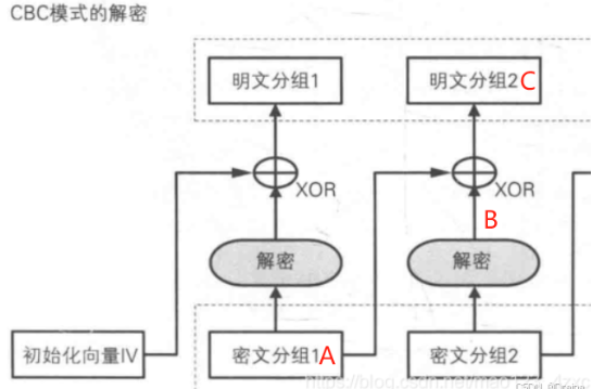 在上图中,密文分组1为A,密文分组2进行解密运算后为B。明文分组2为C。