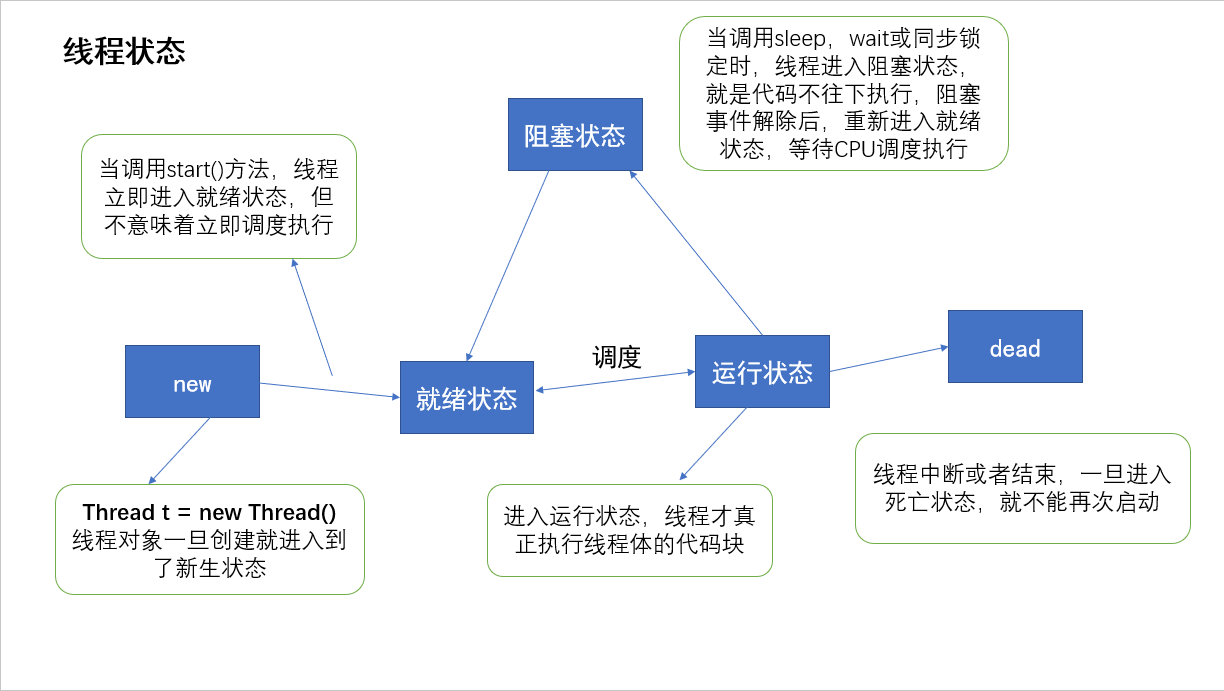 注意:很多多线程是模拟出来的,真正的多线程是指有多个cpu,即多核,如服务器。如果是模拟出来的多线程,即在一个cpu的情况下,在同一个时间点,cpu只能执行一个代码,因为切换的很快,所以也就有了同时执行的错觉。
