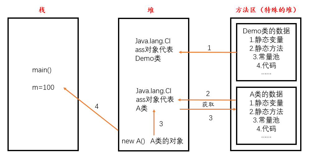 加载完类之后,在堆内存的方法区中就产生了一个Class类型的对象(一个类只有一个Class对象),这