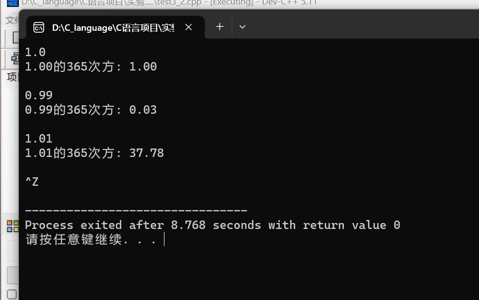 #include <stdio.h> #include <math.h> int main() { double x, ans; while(scanf("%lf", &x) != EOF) { ans = pow(x, 365); printf("%.2f的365次方: %.2f\n", x, ans); printf("\n"); } return 0; }