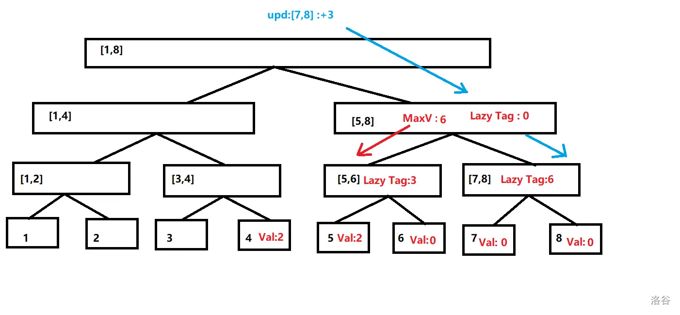 这里的线段树就需要懒标记和$push\_down$了,因为大区间的Lazy Tag被下放之后可以让小区间的值变大,以更改大区间最值,