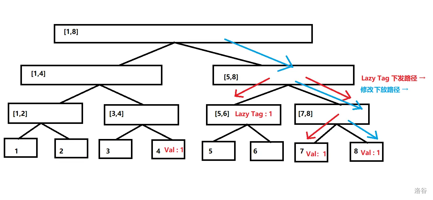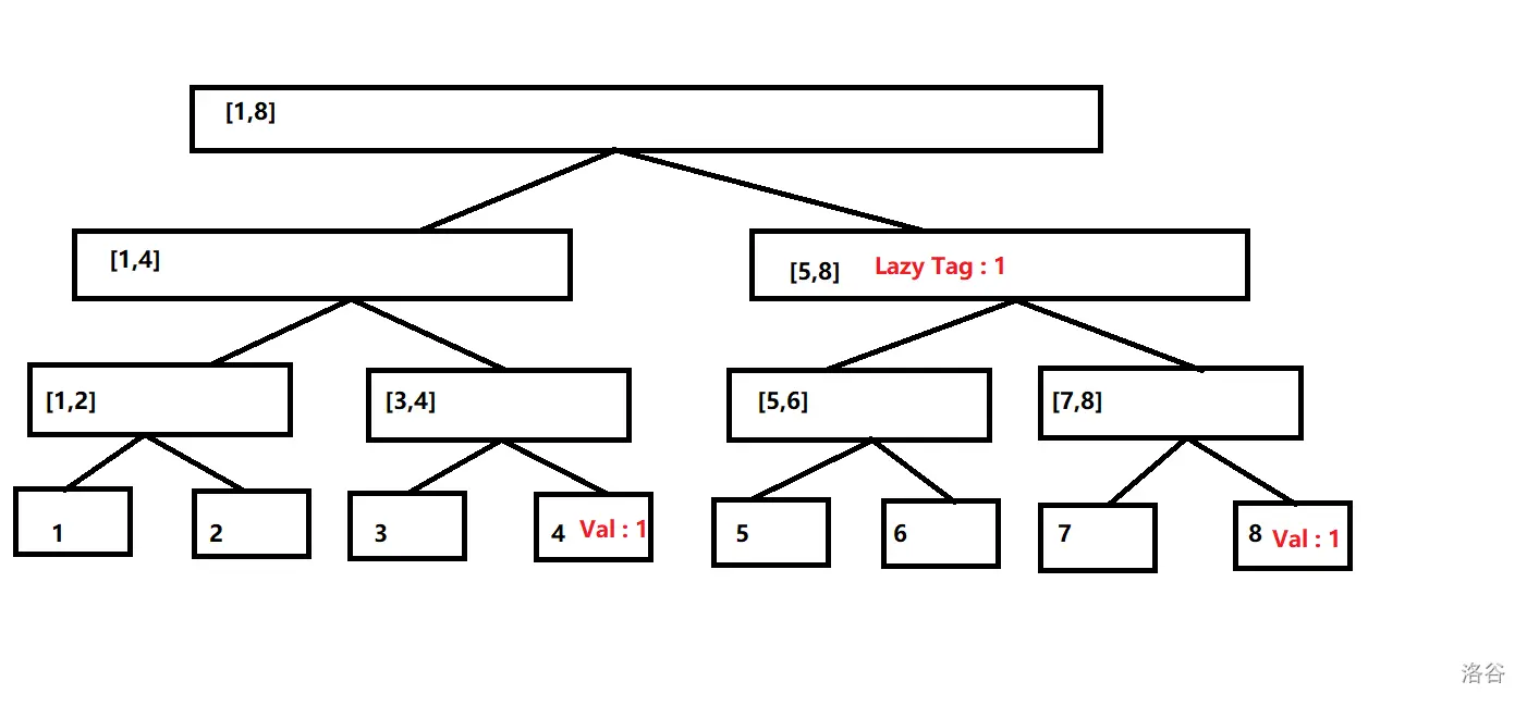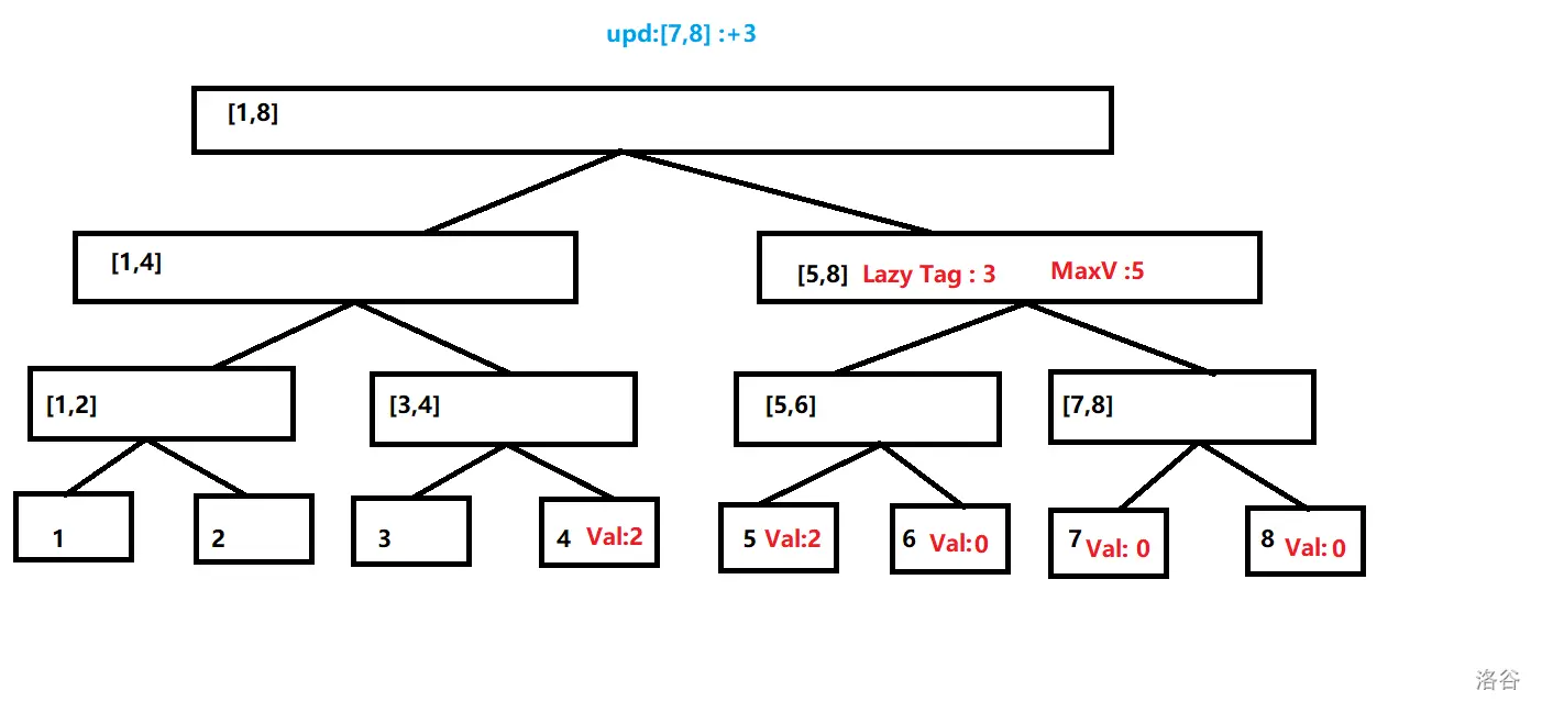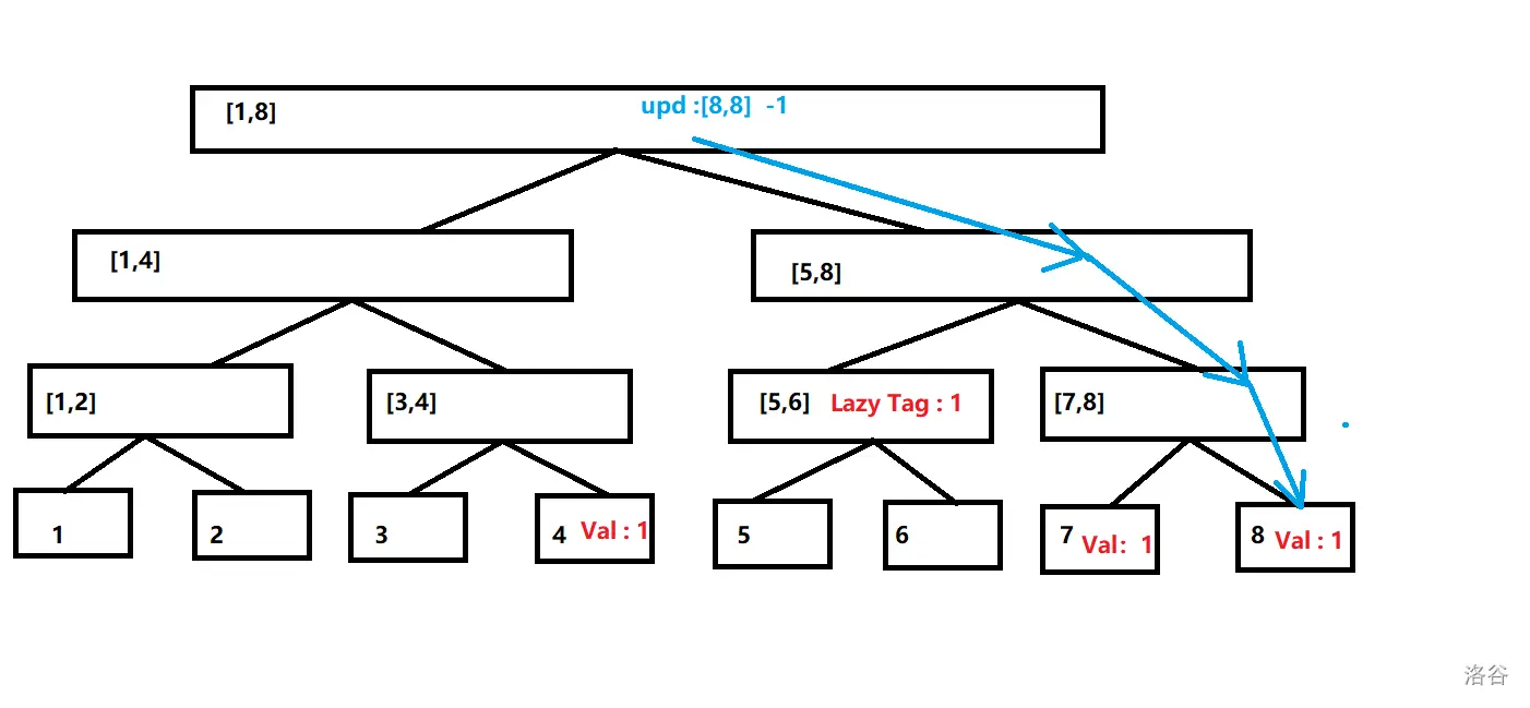 然后我们现在要对$[8,8]$节点进行减1,按照普通线段树的思想,我们需要在修改被分配到$[5,8]$之后将$[5,8]$的Lazy Tag 下放,如图。