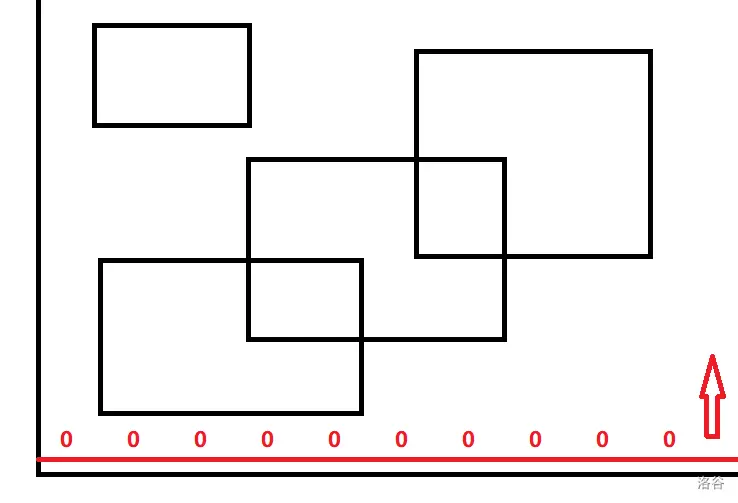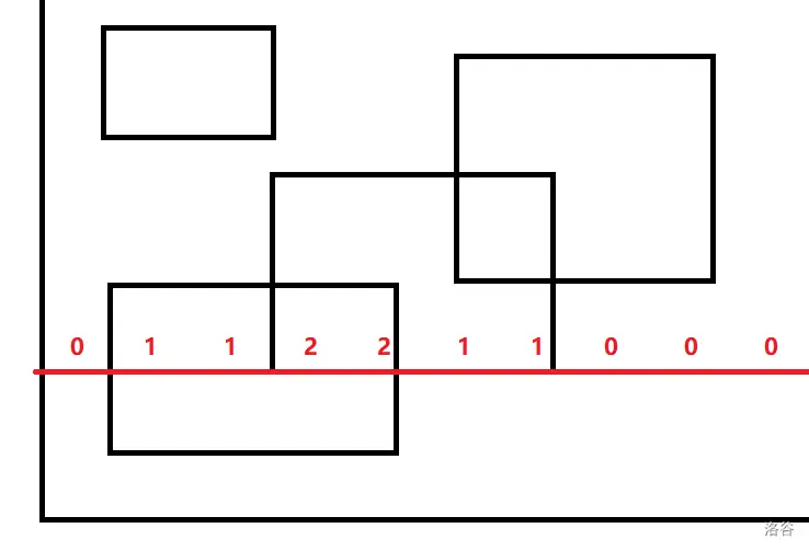 我们维护这条直线,直线上的每一条线段维护这段目前被覆盖的次数,让这条直线从下向上平移。
