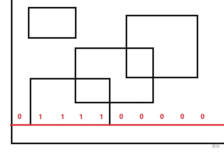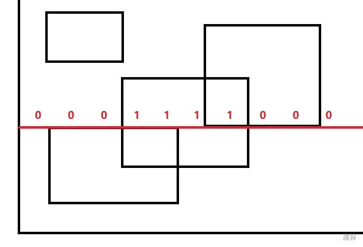 每当遇见一个矩形的下边框时,就将这段,区间被覆盖的次数加一,代表矩形覆盖了这段线段,遇到上端点就将该区间的覆盖次数减一。