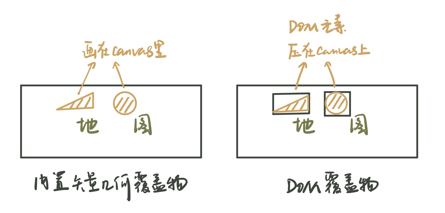 在地图上添加覆盖物有两种方式,一是在canvas画布上渲染,比如JSAPI GL绘制MultiMarker/MultiPolygon等矢量图形覆盖物就是通过编写对应图形的数据解析及渲染程序,直接绘制在底图上层。这样的渲染方式下视角变换时图形也可以实现3D形变。另一种方式是通过CSS布局将其他DOM元素叠加到地图容器之上,这种方式下视角变换时DOM元素需重新计算布局,比如JSAPI v2的Marker/Polygon等覆盖物,以及JSAPI GL的InfoWindow信息窗,这些都属于DOM覆盖物。