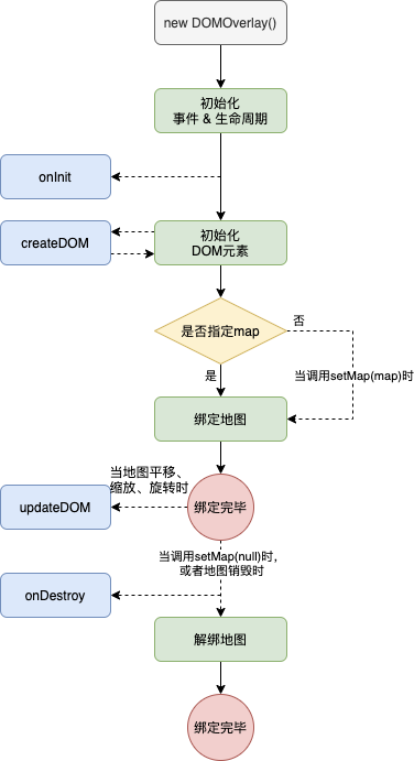 要将自定义覆盖物显示在地图上,首先得明确具体的地图实例,有两种办法,一是在初始化参数中定义map属性,二是通过setMap进行动态设置,可以绑定到另一个地图实例上,或者解绑。setMap做了什么呢?绑定时一方面主要是将createDOM()返回的DOM元素加入到特定的节点下,使其覆盖在地图上方且可以进行相对定位;另一方面是监听地图变换执行updateDOM(),使DOM元素可以跟随地图更新定位或内容。解绑时则是将其从父节点下去除,同时删除对地图事件的监听。