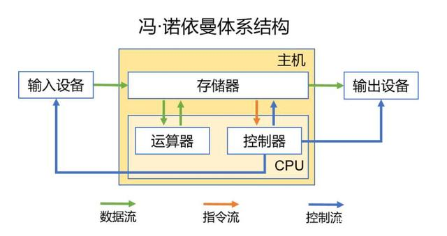 冯诺依曼体系结构的指令和数据均采用二进制码表示;指令和数据以同等地位存放于存储器中,均可按地址寻访;指令由操作码和地址码组成,操作码用来表示操作的性质,地址码用来表示操作数所在存储器中的位置;指令在存储器中按顺序存放,通常指令是按顺序执行的,特定条件下,可以根据运算结果或者设定的条件改变执行顺序;机器以存储器为中心,输入输出设备和存储器的数据传送通过存储器。