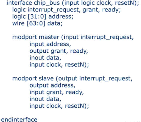 - 接口引入了modport来作为moduleport的缩写,表示不同的模块看到同一组信号时的视角(连接方向)。