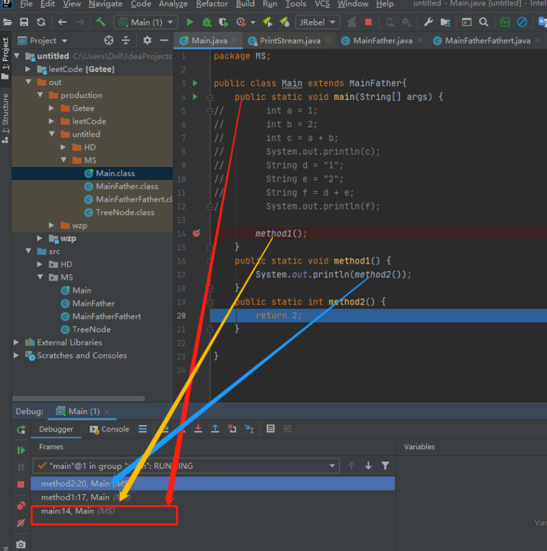 在debug时会发现方法被一个一个压入栈 当一个栈调用结束会进行出栈,如果有返回值将返回值返回给下一个栈帧在下一个栈帧运行代码,进行出栈操作