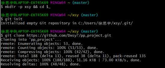 2.创建一个目录,叫做xsy,使用git init 命令在当前目录下初始化生成一个空的 Git 仓库。在终端上运行的命令 git clone,克隆自己的远程仓库。