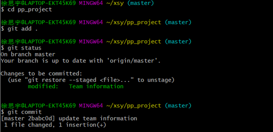 3.切换到pp_project目录,对Team information文件进行修改添加组队信息。暂存被修改的的文件检查后提交commit。
