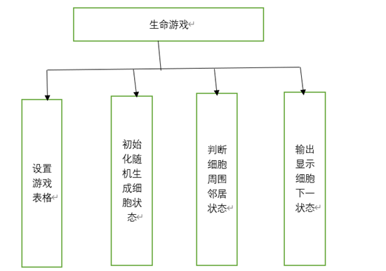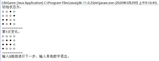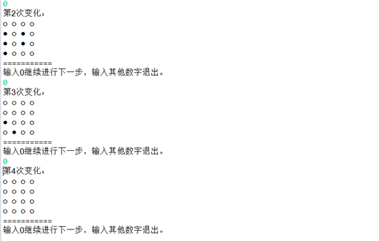 初始状态随机产生,输入0继续显示生命游戏的下一状态,黑色圆点代表细胞存活,白色代表细胞死亡,表格全部转为白色游戏结束。输入其他数字则退出游戏。