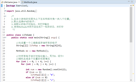 在主函数中我们选定了一个4*4的矩阵,并将矩阵中邻居状态进行初始化,然后引用methods类中的三个方法进行变换。