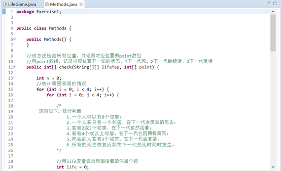 (1)check方法,用来检测存放着所有邻居状态的二维矩阵的所有位置,并用point数组,记录对应位置下一轮的状态,用代表1下一代死,2下一代继续活,3下一代复活;