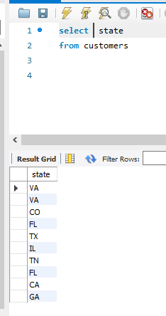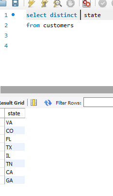 使用distinct来区别是不是唯一的数据,比如说我之前有2个顾客,都来自Virginia 州(VA),使用
