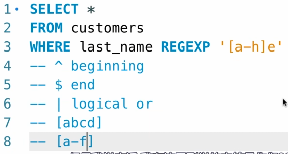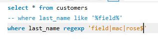 还可以这么写:where last_name regexp 'field | mac | rose' 表示这个字符串中可以含有 field 或者 可以含有 mac 或者可以含有 rose!