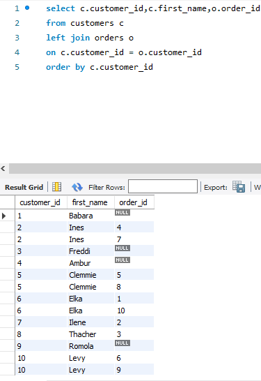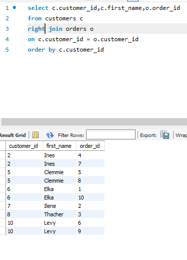 right join 的时候,前面的表格例如 customers c如果有null的值,那就不能进行一个返回操作,之后的表格就显示没有