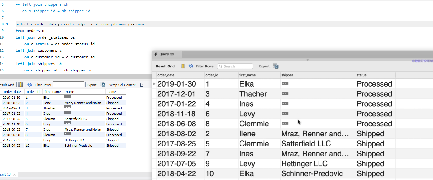 这个句子就是表示:合并orders 和 customers两个表 ,通过orders的customers id和customers 的customer id相同的条件来进行合并的!!