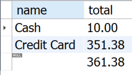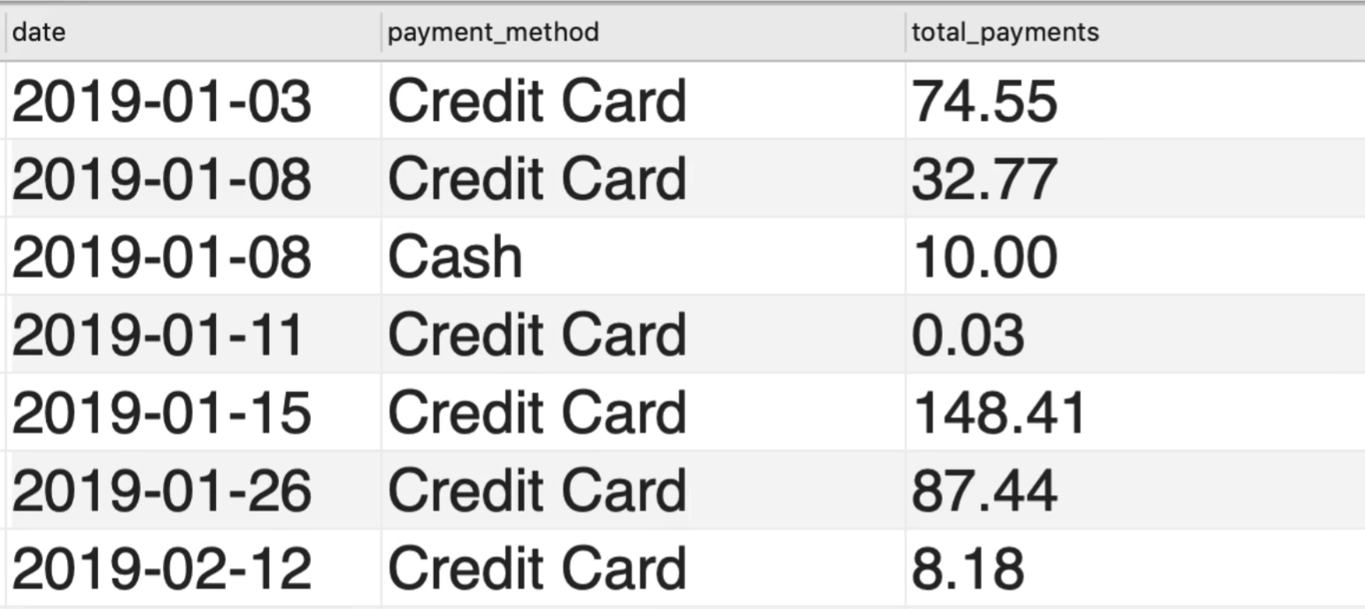 select date, payment_method.name sum(amount) as total_payments from payments p join payments_methods pm on p.payment_method = pm.payment_method_id group by date,payment_method order by date