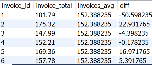 select invoice_id, invoice_total, (select avg(invoice_total)from invoices) as invoices_avg, invoice_total-(select invoices_avg) as diff from invoices