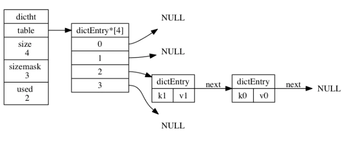 typedef struct dictht { // 哈希表数组 dictEntry **table; // 哈希表大小 unsigned long size; // 哈希表大小掩码,用于计算索引值 // 总是等于 size-1 unsigned long sizemask; // 该哈希表已有节点的数量 unsigned long used; } dictht;