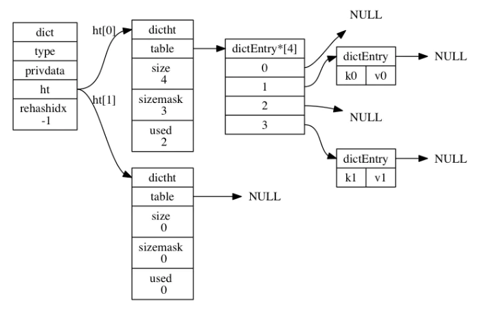 typedef struct dict { // 类型特定函数 dictType *type; // 私有数据 void *privdata; // 哈希表 dictht ht[2]; // rehash索引 // 当rehash不在进行时,值为-1 int rehashidx; } dict;
