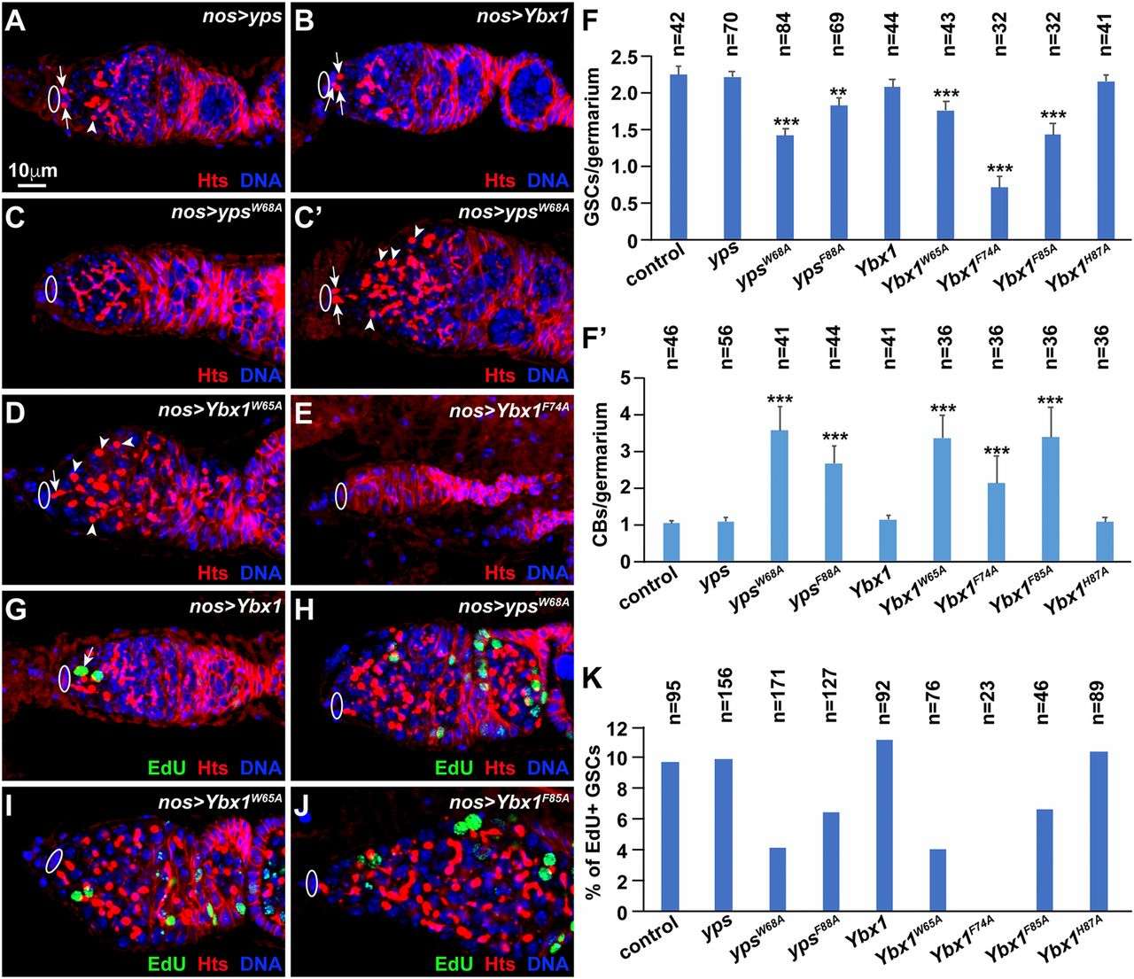 功能实验证明,当将这些关键位点进行缺失突变之后,YBX1无法与RNA结合。不能结合RNA的YPS突变体W65A,F74A以及F85A表现为显性失活,会打乱果蝇生殖干细胞的发育。结果表明,YBX1和YPS中的Trp65,Phe74和Phe85对其体内功能至关重要。