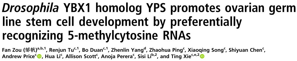 2020年02月18日,Stower研究所解亭教授团队与南方科技大学李思思团队合作研究发现果蝇的YPS蛋白通过优先结合带有m5C修饰的RNA,从而促进果蝇卵巢生殖干细胞的发育。该成果以“Drosophila YBX1 homolog YPS promotes ovarian germ line stem cell development by preferentially recognizing 5-methylcytosine RNAs”为题在线发表在《美国国家科学院院刊》(PNAS)(IF 11.205)期刊上。