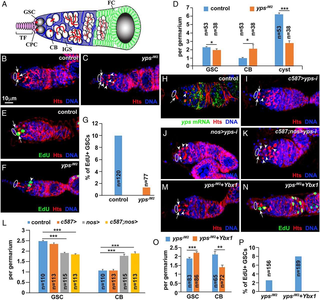 图4:RNA结合缺失YPS和YBX1突变的种系特异性表达严重干扰GSC发育