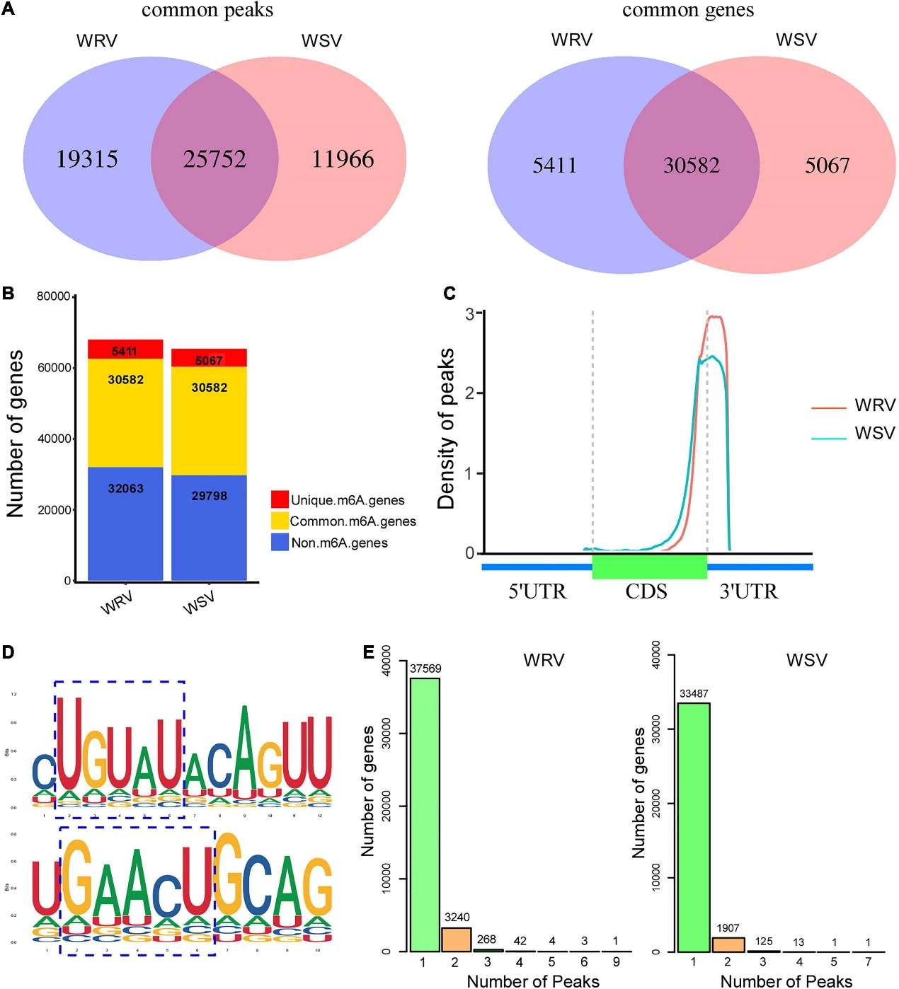 m6A甲基化是真核生物中mRNA、tRNA、miRNA和长链非编码RNA转录后修饰中最常见的修饰。m6A甲基化已被证明与植物对病原体的抗性有关。然而,小麦(Triticum aestivum)m6A全转录组图谱及其在小麦抗小麦黄花叶病毒(wheat yellow mosaic virus,WYMV)中的潜在生物学功能尚未见报道。本研究首次绘制两个不同抗WYMV小麦品种的转录组m6A谱。通过分析m6A-seq数据,作者在WYMV感染的抗病小麦品种(WRV)和WYMV感染的敏感小麦品种(WSV)中鉴定了25752个共有m6A peaks和30582个共有m6A基因,peaks主要富集在编码序列的3'UTR区和终止密码子区。m6A-seq的GO分析和RNA-seq数据显示,m6A和mRNA水平均发生显著变化的基因与植物防御反应有关。KEGG分析显示,这些基因在植物-病原体相互作用途径中富集。作者通过MeRIP-qPCR和RT-qPCR进一步验证了m6A和mRNA水平的变化。本研究证明m6A甲基化在小麦抗WYMV中的作用,为RNA m6A甲基化在小麦抗RNA病毒感染中的潜在功能作用奠定坚实基础。