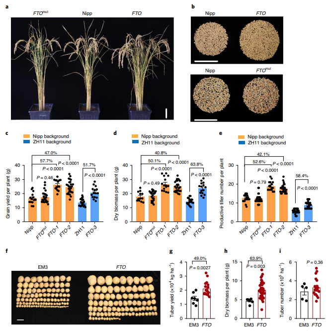 图:FTO表达提高了水稻和马铃薯的产量和生物量
